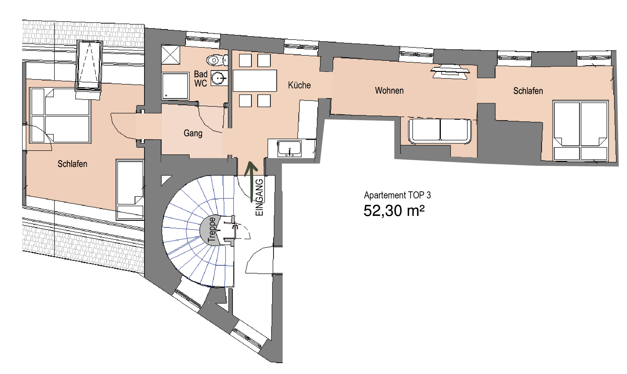 Die Mauern erzählen eine jahrhundertealte Geschichte. Als Teil der Stadtmauer ist das Haus ein fester Bestandteil der Kremser Altstadt und spiegelt die Architektur der verschiedenen Zeitepochen wider. Die Holztreppe, die Sie auf dem Weg in Ihr Appartement betreten, ist 400 Jahre alt. Diese wurde bewusst im Originalzustand belassen. Das Herz des Hauses ist noch immer der Stadtturm, welcher mit Mauern von 1,70 m Breite das Gebäude seit Jahrhunderten stolz trägt.